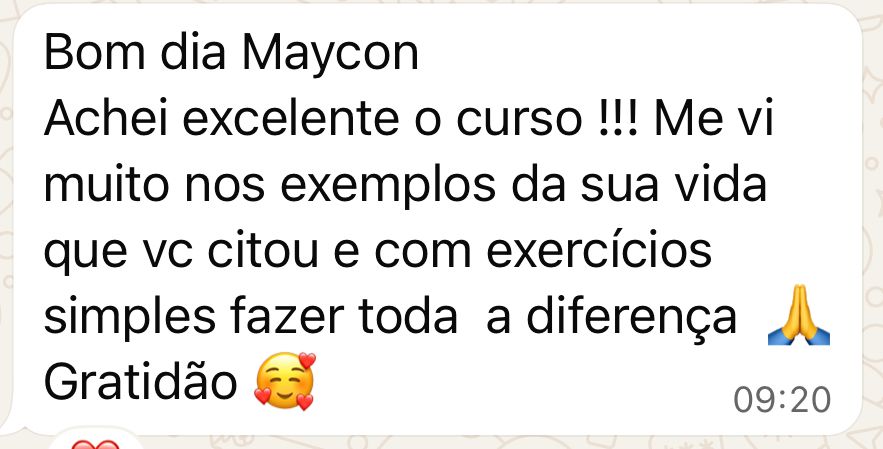 Em relação ao curso sincronia tenho vários pontos em que me identifiquei. Sou bastante acelerada, sempre correndo e atrasada. Assumo diversas atividades para fazer ao mesmo tempo e enfim, difícil dar conta. Agora estou aposentada e quando participava do curso, percebi várias técnicas que poderia ser utilizada enquanto estava trabalhando e eu por falta de conhecimento, nunca utilizei. Faço exercícios de respiração, oração, enfim o que foi passado no curso. Aquela paradinha que pode fazer a diferença na vida da gente. Gratidão Maycon, pelas dicas valiosas que ajudam a gente a viver e conviver melhor!